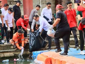 Gubernur Khofifah bersama Pasukan Marinir mengajak warga Jatim menjaga kebersihan Kali Surabaya. Aksi ini mendukung gerakan 'Jaga Sungai, Jaga Kehidupan'.