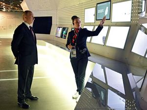 Presiden Rusia Vladimir Putin mengunjungi pameran besar prestasi Rusia. Dalam kesempatan itu, Putin ditunjukkan simulasi tombol nuklir.