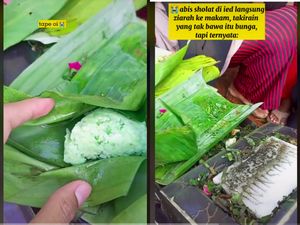 Sama-sama dibungkus daun pisang, orang ini salah bawa tape ketan yang dikiranya adalah bunga-bungaan saat hendak ziarah ke makam. Aksinya sukses bikin ngakak.