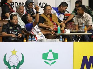 Presiden ke-6 RI Susilo Bambang Yudhoyono menonton Proliga 2023. Proliga mempertandingkan Palembang Bank Sumselbabel melawan Jakarta Lavani Allo Bank.
