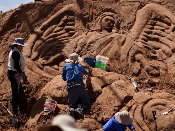 Seniman membuat patung Jalan Salib raksasa di bukit pasir Bolivia. Pasir Oruro di bagian barat negara ini telah diubah menjadi kanvas raksasa.