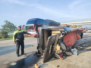 Kecelakaan mobil pikap di Maros, Sulsel, terjadi akibat pecah ban, mengakibatkan sopir dan penumpang luka. Muatan botol kecap dan saus tumpah ke jalan.