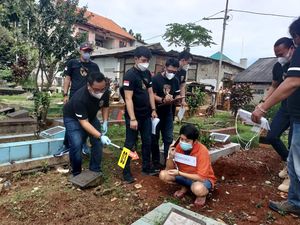 Polisi menggelar rekonstruksi pembunuhan Chef Fiky Firlana di TPU Chober Ulujami, Jaksel. Rekonstruksi dihadiri oleh para tersangka.