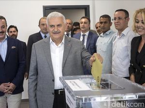 Presiden Turki, Recep Tayyip Erdogan, memberikan hak pilihnya di Pemilu Turki di Istanbul. Ini momen saat Erdogan ditemani cucunya di TPS