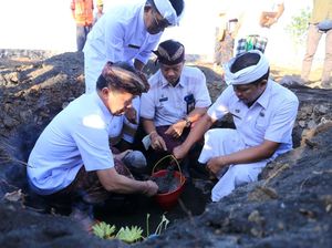 Bupati Klungkung, I Nyoman Suwirta melakukan peletakan batu pertama terkait penataan area pedagang di Pura Goa Lawah, tepat saat Tilem Sasih Kasa.