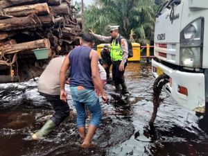 Kemacetan panjang terjadi di Jalintim, Pelalawan, Riau akibat banjir. Polisi sebut menyiagakan perahu karet untuk bantu evakuasi kendaraan yang mogok.