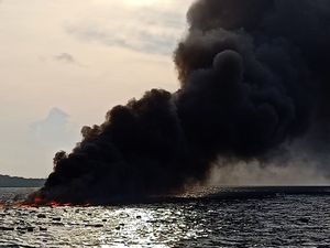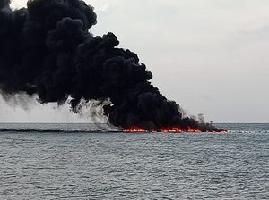 Perahu Tanis Cargo terbakar saat berlayar di perairan Kusamba, Klungkung, Bali. Empat ABK menyelamatkan diri dengan cara meloncat ke laut.