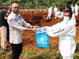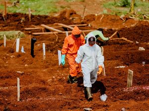 Potret Petugas Tandu Jenazah Covid-19 di Tanah Becek TPU Rorotan