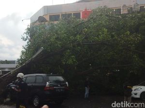 Hujan dan angin kencang di Klaten menyebabkan pohon beringin tumbang, dan menimpa empat mobil.