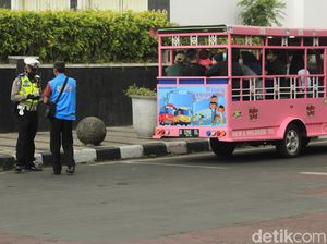 Mobil odong-odong terjaring penyekatan ganjil-genap di Jalan Asia Afrika, Kota Bandung. Mobil yang mengangkut penumpang itu langsung ditepikan petugas.
