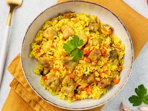 Tak hanya diracik dengan cabe dan bawang saja, nasi goreng juga enak dibumbui kunyit yang kaya khasiat. Ditambah daging ayam, semakin enak rasanya.