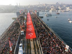 Unjuk rasa pro-Palestina menarik ribuan orang ke Jembatan Galata Istanbul pada Hari Tahun Baru. Massa menuntut hentikan genosida di Gaza.