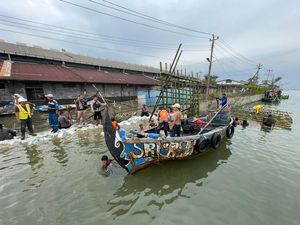 Warga Dusun Mampie, Polman, membangun tanggul darurat 300 meter untuk mencegah abrasi pantai menggunakan karung yang diisi pasir.