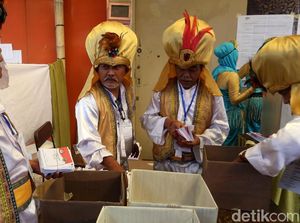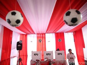 Panitia Pemungutan Suara TPS 05, Jl Cibadak, Kota Bandung, berkostum Piala Dunia 2018 saat pemungutan suara Pilgub Jabar dan Pilwakot Bandung, Rabu (27/6/2018).