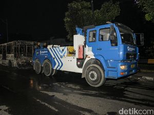 Api yang membakar TransJakarta di dekat Pasar Baru, Jakarta Pusat, sudah padam.
