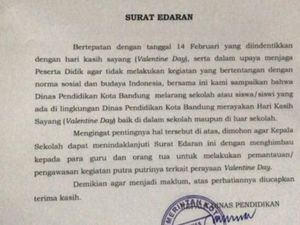 Larangan merayakan Valentine Day itu diterbitkan Disdik Kota Bandung melalui surat edaran tertanggal 10 Februari 2020.