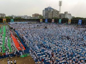 Sejumlah anak muda di India menampilkan aksi tak biasa di perayaan Hari Yoga Internasional. Mereka melakukan yoga dari atas motor. Ini fotonya.